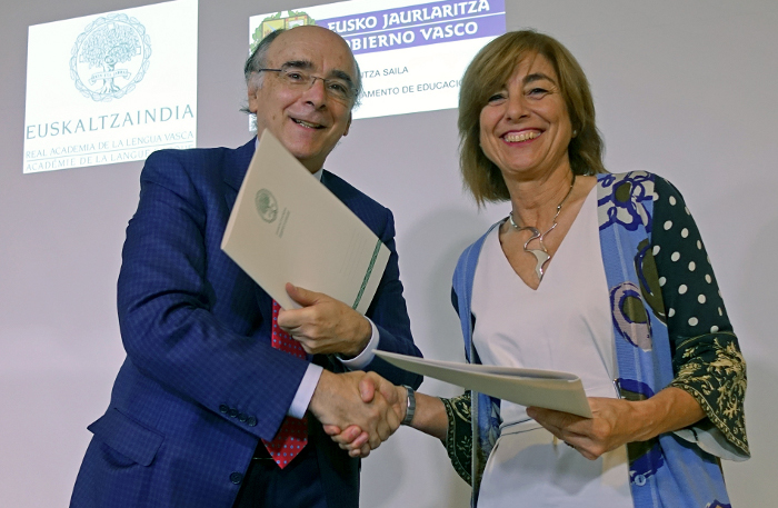 Cristina Uriarte Hezkuntza sailburuak eta Andres Urrutia euskaltzainburuak erakunde bien arteko akordioa sinatu dute gaur goizean, Bilbon, Euskaltzaindiaren egoitza nagusian. Maiatzak 29an, Eusko Jaurlaritzako Gobernu Kontseiluan aurkeztu eta onartu zen hitzarmen proposamena. Gaurko sinadurak akordioa berretsi egiten du, eta bertan jasotakoa indarrean jarri.