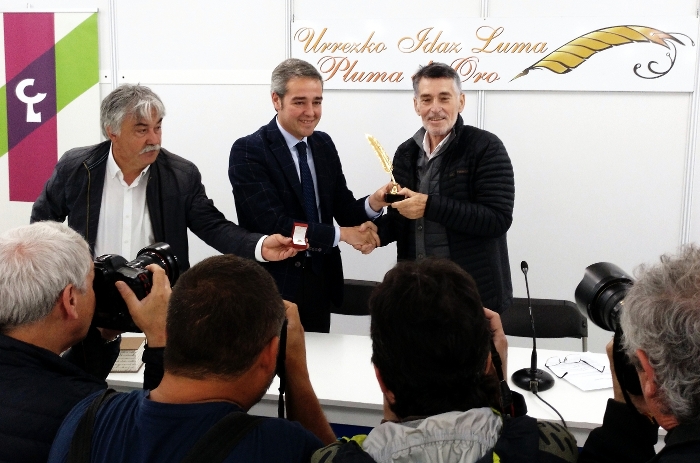 Gaur, Bilboko 48. Liburu Azokaren Urrezko Idaz Luma saria jaso du Joan Mari Torrealdaik. Andoni Iturbe Bizkaiko Foru Aldundiko Kultura zuzendariaren eta Asier Muniategi Azokako arduradunaren eskutik jaso du golardoa.