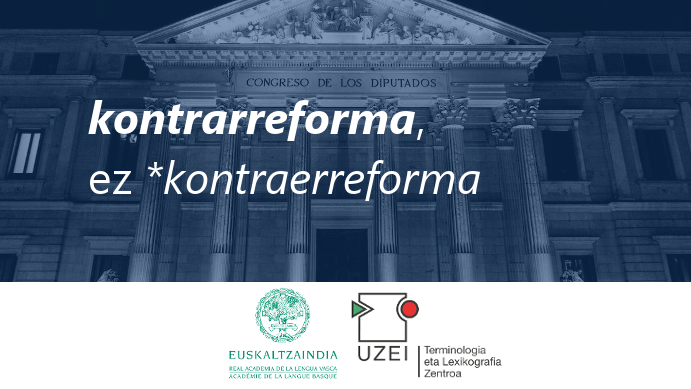 Euskaltzaindiak kontrarreforma (eta ez *kontraerreforma) jaso du hiztegi arauemailean ‘aurreko erreforma bati kontra egiten dion erreforma’ adierarekin. Kontuan izan, bestalde, hitz horrek bigarren adiera bat ere baduela: ‘Luteroren erreformari aurre egiteko Eliza katolikoak eragin zuen erreforma’. Hiztegian zehazten den bezala, K larriz idatzi behar da bigarren adiera hori duenean.