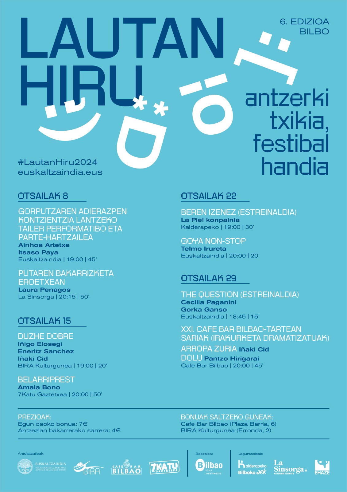Beste behin (eta badira sei aldi), LAUTAN HIRU antzerki-jaialdiak Bilboko Zazpi Kaleetako bazterrak astinduko ditu otsailean. Lau astez eta ostegunetan, euskarazko antzerkia izango da nagusi hiriburuko Alde Zaharrean. Guztira 8 ekitaldi eskainiko dira LAUTAN HIRUren barruan: 5 antzezpen, bakarrizketa bat, tailer performatibo eta parte-hartzaile bat, eta bi irakurraldi dramatizatu (azken bi hauek ekitaldi berean). Gainera, EHAZErekin batera antolatutako Ikusle-klubari ere eutsiko zaio.