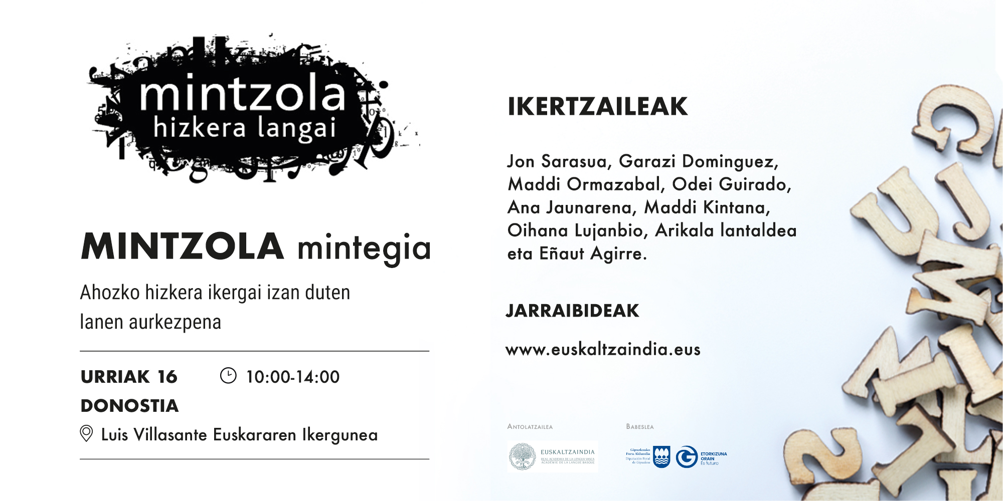 Lan horiez gain, beste erakunde eta ikertzaile batzuekin elkarlanean abitutako azterketen berri emango da mintegian: batetik, Arikala, lagunarteko euskara sustatzeko eta esku-hartzeen eragina neurtzeko ekintza-ikerketa ‒Ikastolen Elkartearekin eta Mondragon Unibertsitateko Humanitate eta Hezkuntza Zientzien Fakultatearekin lankidetzan‒; bestetik, berriz, Ahozko hizkeraren ezaugarriak –Eñaut Agirreren azterlana‒.