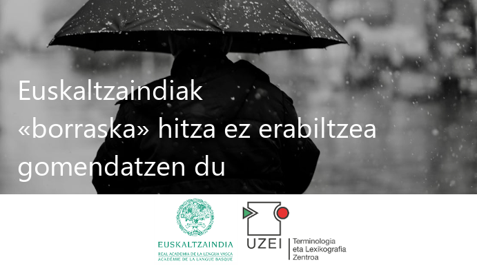 Bestalde, borraska hitza ez erabiltzea gomendatzen du Euskaltzaindiak, eta hiztegian depresio eta ekaitz hitzak ere baditugula gogorarazi du.