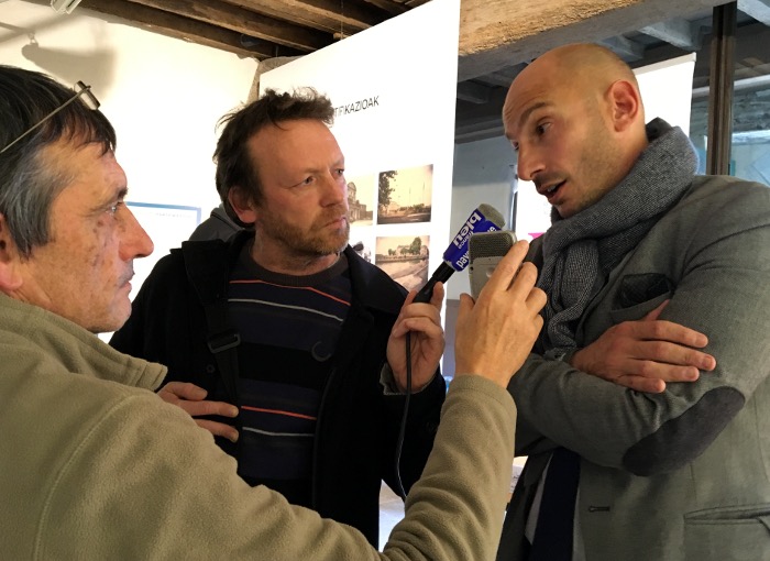 (Xabier Kintana, Koldo Narbaiza, Laura Mintegi, Andres Urrutia, Juan Mari Aburto, Bingen Zupiria eta Juan Mari Atutxa, EGUNAri plaka jartzen, Posta kalean)