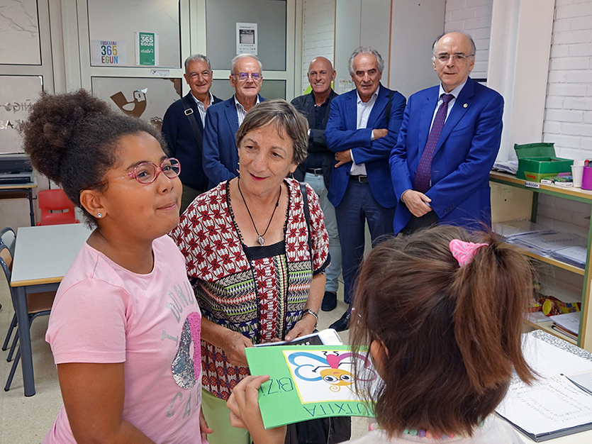 Ikastolako arduradunekin bildu da Euskaltzaindiaren Zuzendaritza; gelak bisitatu dituzte, ikasleekin mintzatu dira eta haritz bat landatu dute.