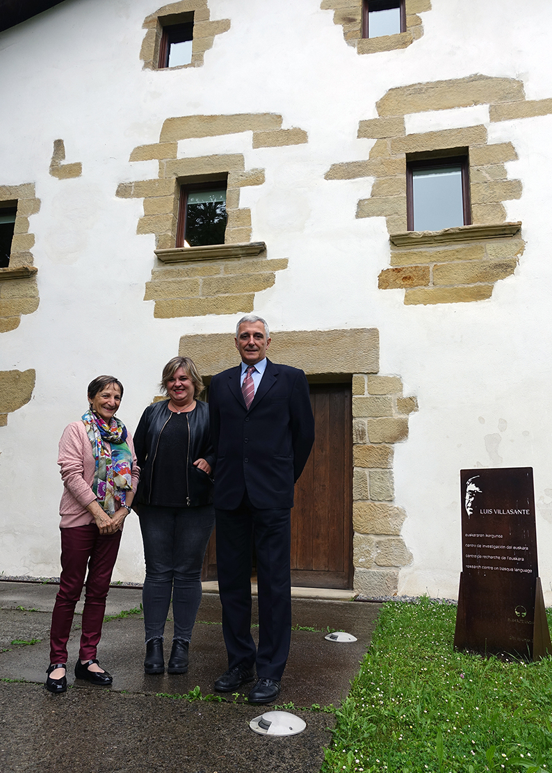 (Sagrario Aleman eta Miriam Urkia euskaltzain osoak, Iñaki Irazabalbeitia Ezkerraberri Fundazioko zuzendariarekin, gaur, Donostiako Luis Villasante Ikergunean)