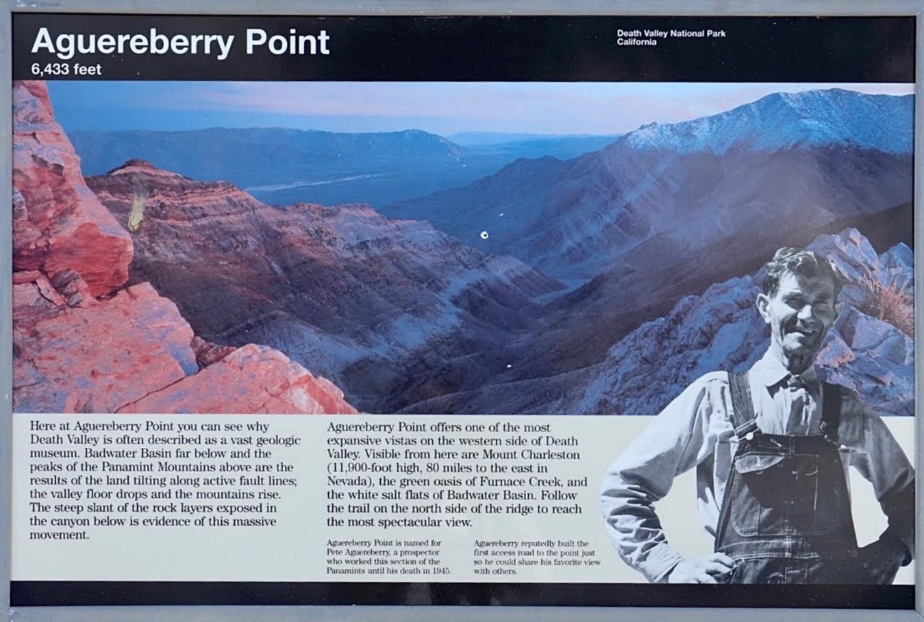Ez da paisaiarekiko sentiberatasuna Far Westeko meatzariekin lotu ohi den sentimendua. Western generoko nobelek eta pelikulek beste era bateko protagonistak erakutsi izan dituzte. Baina horretan ere, beste hainbat arlotan bezala –ez zuen familiarik osatu, bere meatzearen atarian altxatutako etxetxo hartan bizitzen jarraitu zuen, ez zuen jaioterrira itzultzeko asmorik izan–, bere gisakoa izan zen Pete Aguereberry. Miretsi egiten zuen Heriotzaren haraneko paisaia munduz kanpokoa. Eta, eremu haiek Monumentu Nazional izendatuak izan eta turisten jomuga bihurtu baino lehen, Petek zazpi kilometro eta erdiko bidea ireki zuen eskuz, pikotx, pala eta eskorgekin, errautsa zeriola, bere meatzetik gain hartaraino. Aguereberry Point izenaz agertzen da gain hura gaurko mapetan. Galdetzen ziotelarik zergatik galdu zuen hainbeste denbora eta indar bidea egiten, besteek ere ikusmira eder hartaz gozatzea nahi zuela erantzuten zuen.