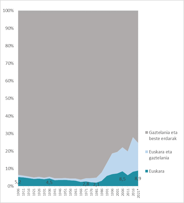 B. GRAFIKOA: HAUR TXIKIEN LEHEN HIZKUNTZAN EUSKARAK IZAN DUEN PISUAREN BILAKAERA. ARABA, 1906-2021 (%)