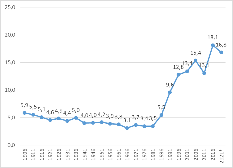 Iturria: Biztanleriaren eta etxebizitzen zentsuak (EUSTAT eta NASTAT) eta Encuesta de Características Esenciales de la Población y las Viviendas, 2021 (INE).