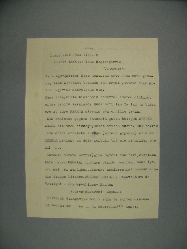 101-141 - BUENABENTURA OIEREGIKOA (O.F.M.Cap.), 1954, gutun 1 Piarres Lafitteri euskaraz