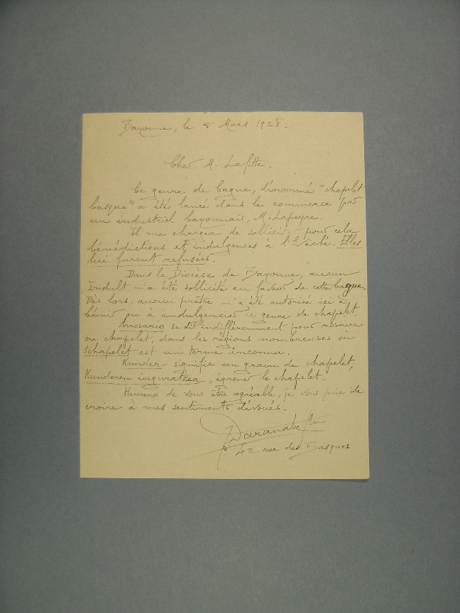 102-183 - DARANATZ, Jean Baptiste (1870-1945), 1928-1940, 4 gutun Piarres Lafitteri, gutun 1 Aita Grégoire [Joanategi]ri