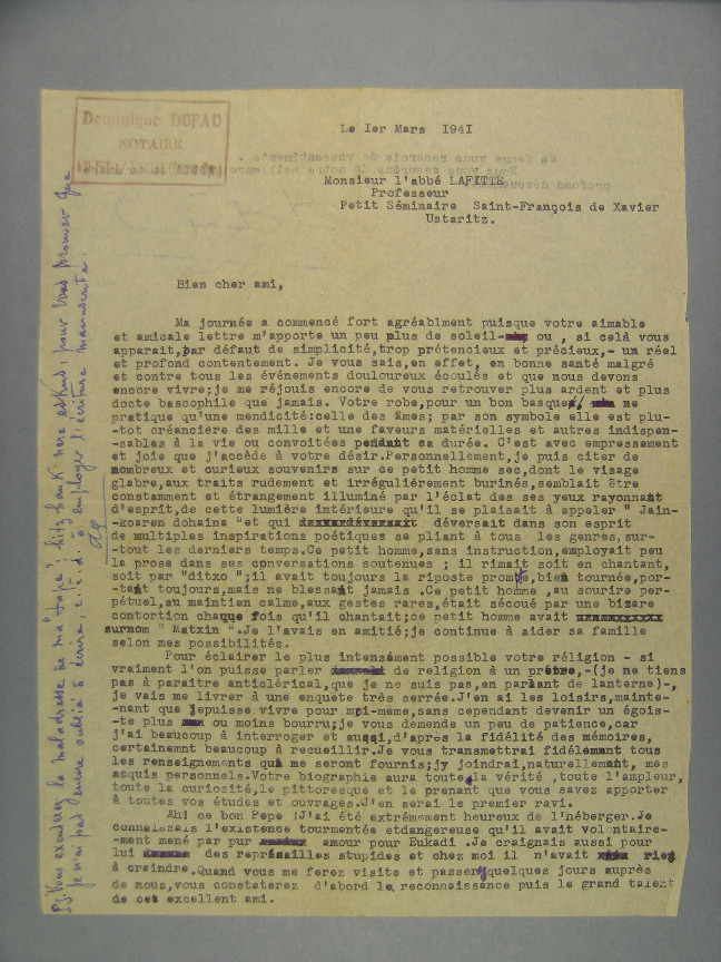102-217 - DUFAU, Dominique (1880-1956), (Senpere), 1941-1949, 4 gutun Piarres Lafitteri. [Ik. g.: 107-825]