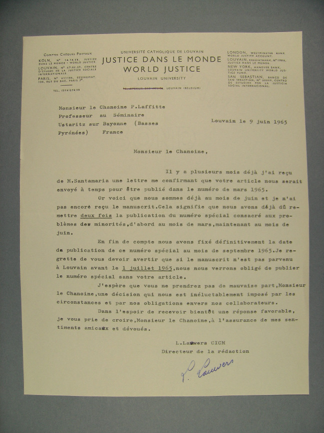 103-456 - JUSTICE DANS LE MOND (aldizkaria) (Louvain), 1965, gutun 1 Piarres Lafitteri. [Ik. g.: 105-696, 107-887 eta 108-934]