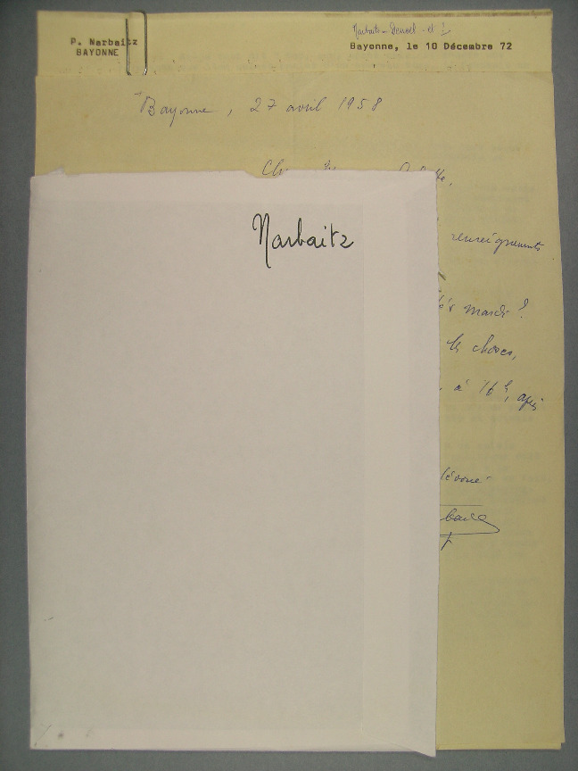 105-601 - NARBAITZ, Piarres (1910-1984), 1937-1980, 27 gutun Piarres Lafitteri hauetatik hogei euskaraz, 2 postal, Denoel argitaletxeari zuzendutako gutunen kopiak