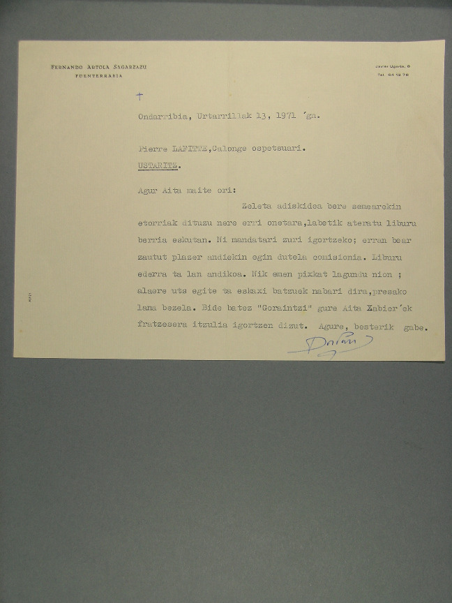 101-065 - ARTOLA SAGARTZAZU, Fernando (1910-1983), 1971, gutun 1 Piarres Lafitteri euskaraz