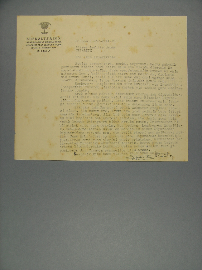 102-298 - EUSKALTZAINDIA, 1928-1980?, 9 gutun Piarres Lafitteri euskaraz, gutun 1 Jean Louis Davantek Piarres Lafitte eta Jean Haritxelhari. [Ik. g.: 107-861]