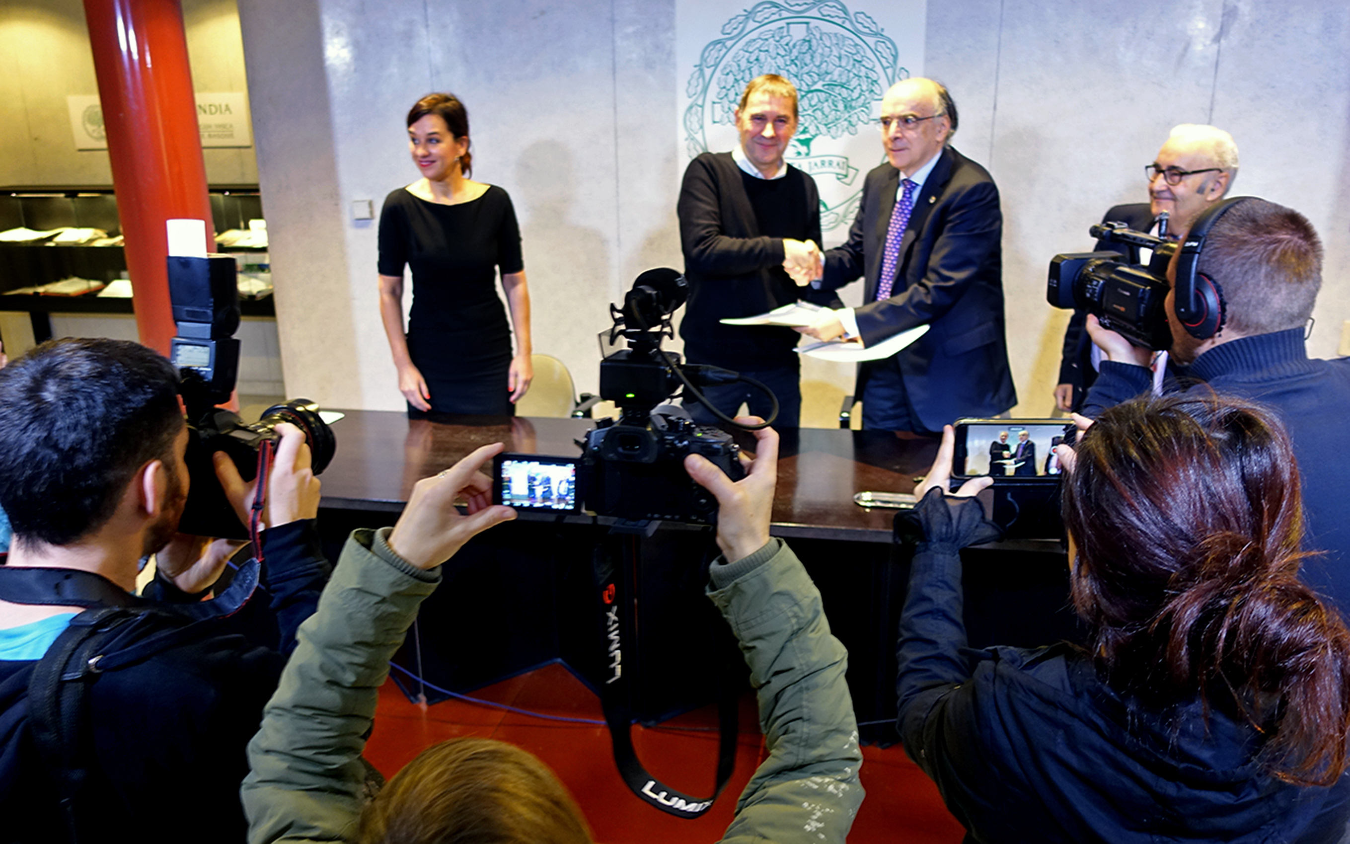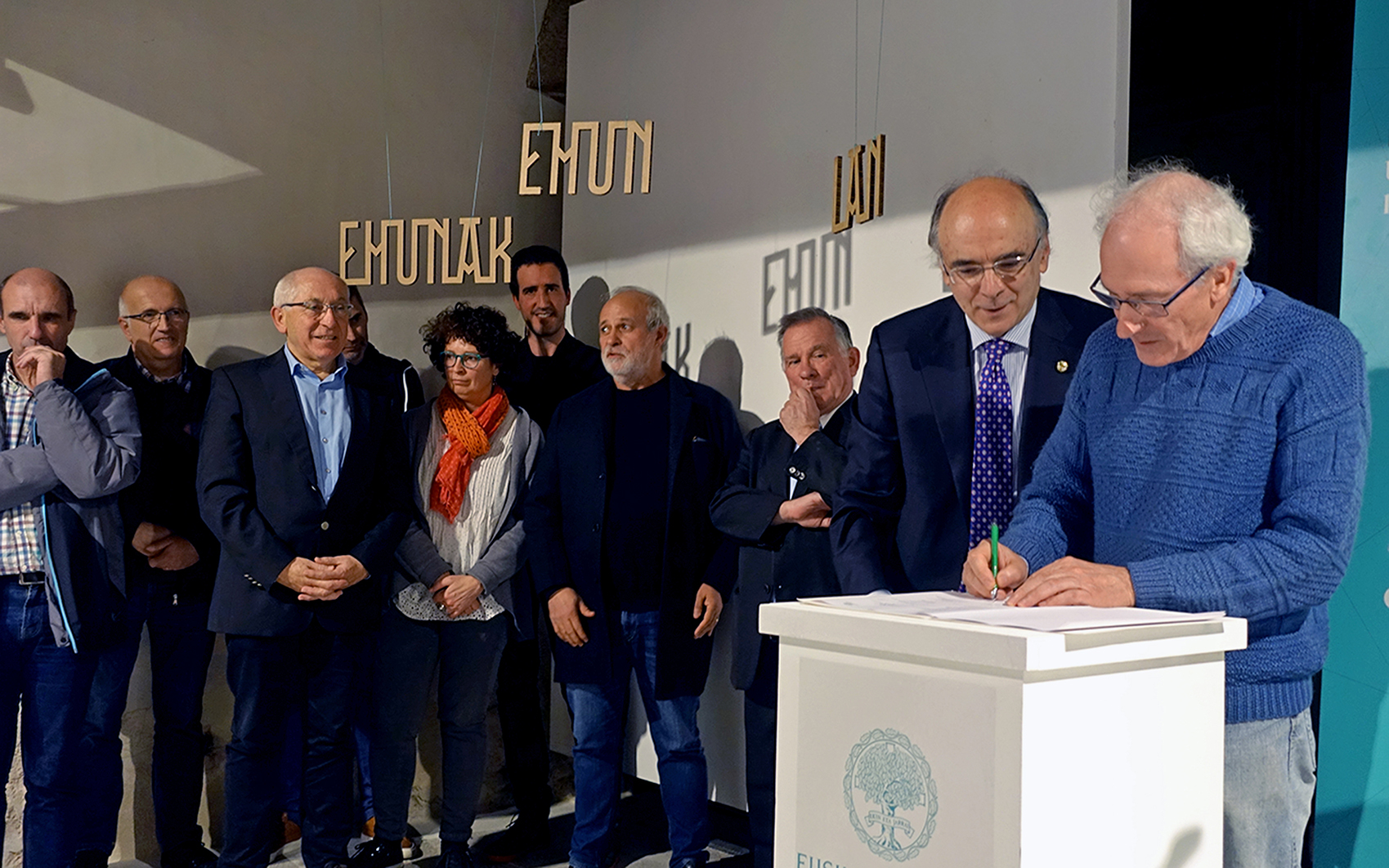 -Arnaldo Otegi EH-Bilduko koordinatzaile nagusiak izenpetu du dokumentua, Euskaltzaindiaren Bilboko egoitzan.