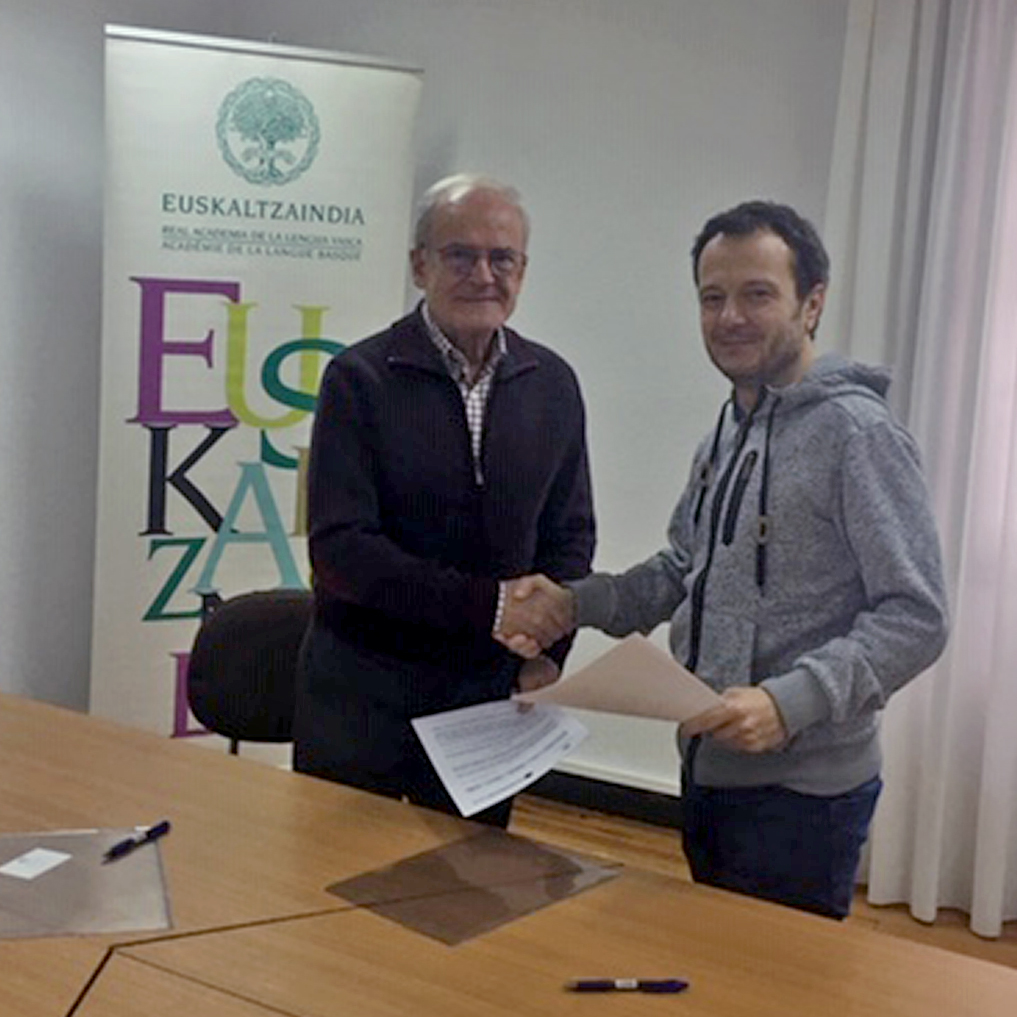 -Juan Kruz Lakasta Euskalerria Irratiko koordinatzaileak izenpetu du lankidetza hitzarmena, Andres Iñigo Euskaltzaindiaren Nafarroako ordezkaria ondoan duela.