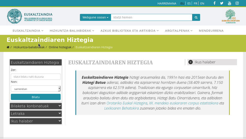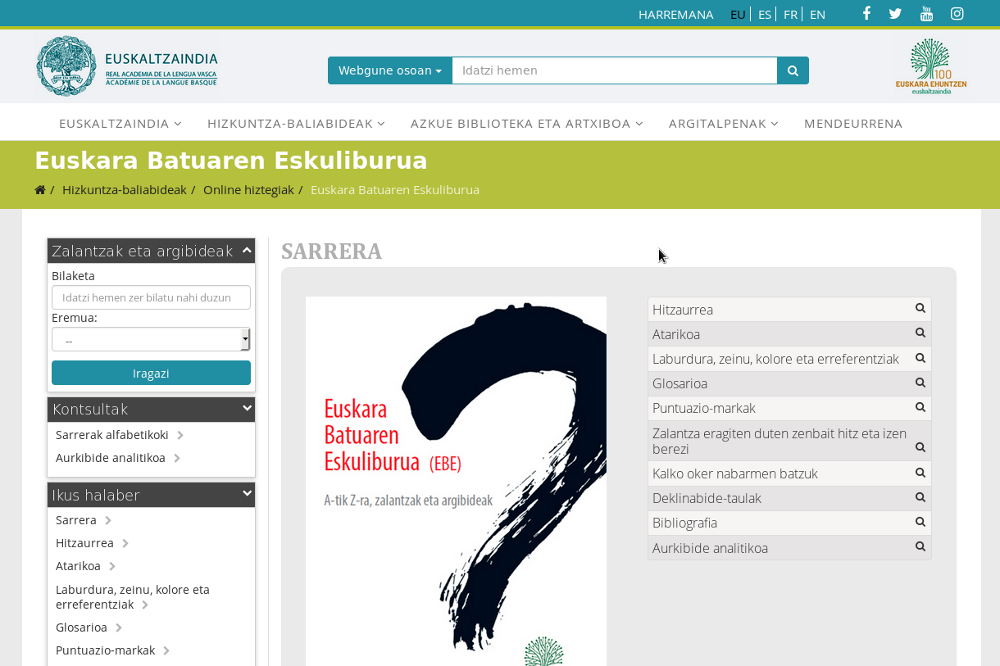 -Atalez atal, Euskaltzaindiaren Hiztegiak 173.533 ikustaldi izan ditu, Orotariko Euskal Hiztegiak 93.252, Euskara Batuaren Eskuliburuak 17.331 (bere bigarren hilabetean), Euskal Onomastikaren Datutegiak (EODA) bikoiztu egin ditu iazko zifrak (164.010 bistaratze), eta Jagonet zerbitzuak ere gora egin du (12.893 bistaratze).